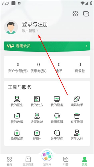 1、在春雨医生app的主页面,点击底部“我的”选项,进入个人中心页面。