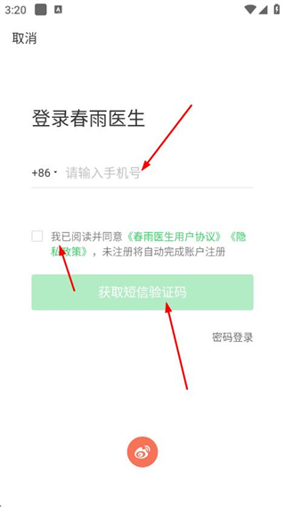 3、在登录页面输入手机号码,勾选同意用户协议后点击获取短信验证码。