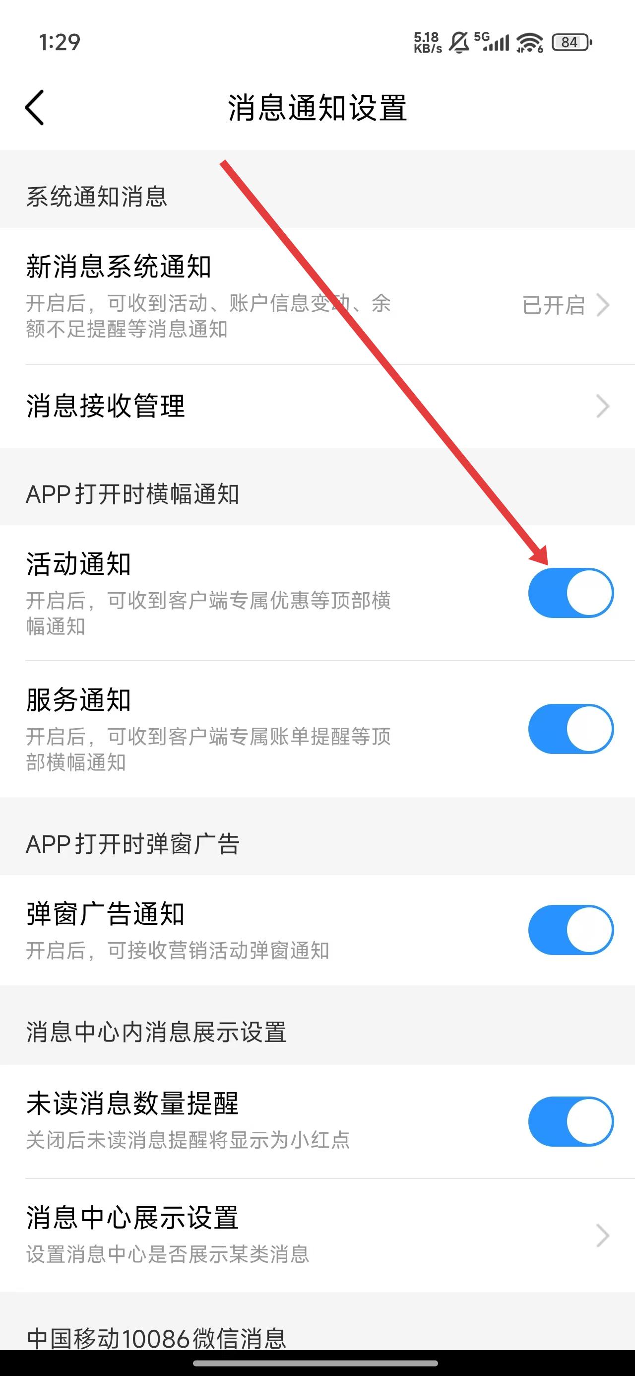 4、进入到消息通知设置页面里,可以点击活动通知右侧的开关按钮后,关闭活动通知功能。