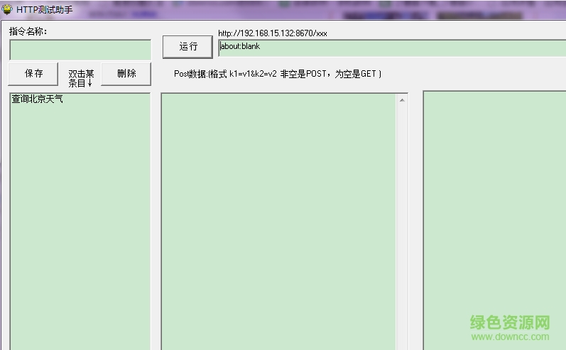 在地址栏输入请求地址格式http://IP:port/path,如果是get,点运行即可。如果是post,在post数据区,按照key=value&key=value格式输入post数据,点运行。在指令名称区,输入一个自定义名称可以保存此指令,双击命令列表,可以再次调出此指令,再次点运行,又可以执行。