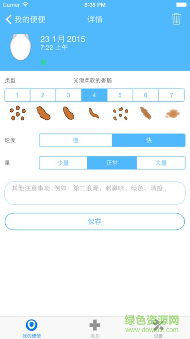 拍摄完成后会自动跳转到“详情”界面,在这里你可以对你的便便的“类型”、“速度”、“量”进行详细的描述。便便达人采用布里斯托大便分类法对便便进行分类,根据选择类型的不同,捕捉照片傍边的字,红色的“不好”和绿色的“好”也会相应的变化。此外,应用还有一个描述栏可供使用者填写比如粪便颜色、气味等辅助说明。