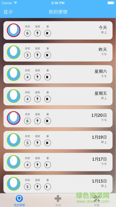 便便达人是一款记录便便的健康软件,随时可查看排便情况,这这里为大家提供了便便的类型、速度等多方面信息,随时可掌握自己的身体状况。快来绿色资源网下载使用吧!