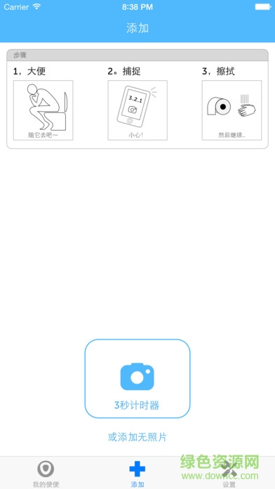 使用便便达人记录排便情况很简单,只需在你与??告别之前,点击“添加”界面中的相机图标,启动3秒倒计时,给它拍照留念即可。 3秒倒计时拍摄的细节设计,免去了点按拍摄键导致手机不慎滑落的尴尬。如果你不想拍照的话,便便达人也提供了无图模式,最终会以卡通图片代替。
