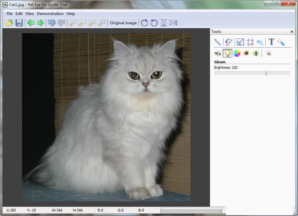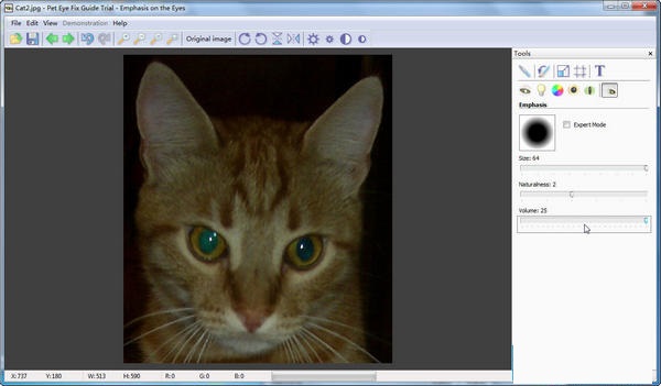 Pet Eye Fix Guide是一款能轻松帮你处理照片红眼的软件,程序可以帮助你修复消除因拍摄时闪光灯造成的异样眼睛(人物摄影俗称“红眼”),软件智能校正红眼,无需您费劲得去选择眼区。允许您修复包括完全损坏的闪光造成的白眼等。这款软件可以独立运行,也可以作为photoshop的一个单独的滤镜来调用!程序自带动态图片演示教程,可以帮助你轻松的掌握软件的用法!这款插件可以应用任何颜色 -- 红色、黄色、绿色、蓝色,甚至白色的,并在整个眼睛获得眼神光。