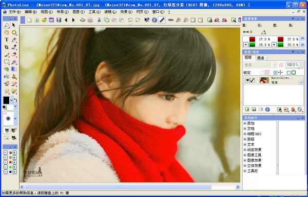 PhotoLine 具有图层处理、Photoshop 滤镜插件、图层样式、网页图像制作、网页动画制作、矢量作图、插入文字图层、多页面处理(可编辑 PDF 文件、icon 文件)等高级图像处理软件的功能。