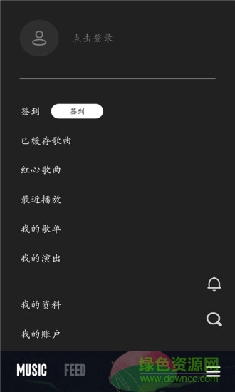 已缓存歌曲、红心歌曲、最近播放、我的歌单、我的演出、我的资料、我的账户!