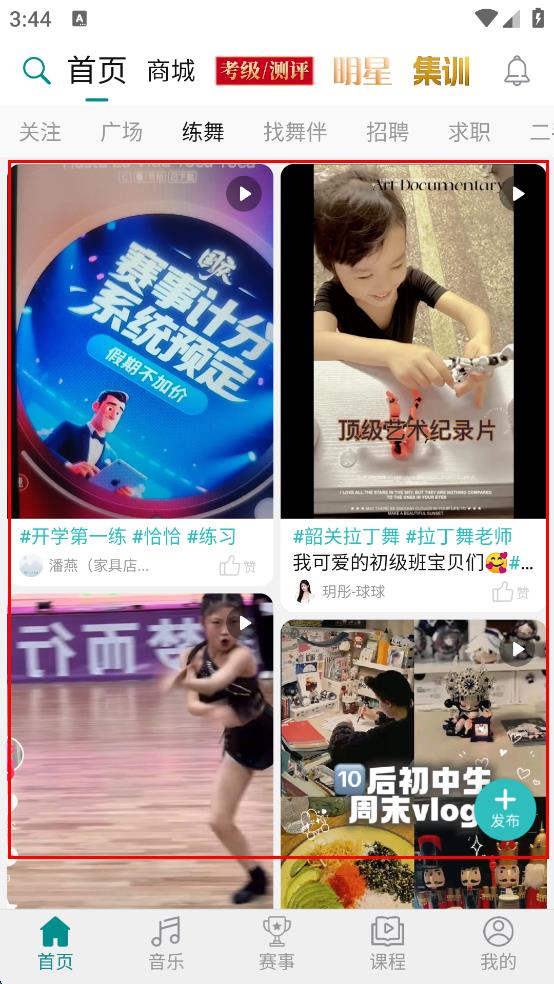 3、在练舞内容展示页面,浏览各类练舞相关的视频等内容,选择其中想要查看的内容,点击该内容对应的区域,进入内容详情页面。