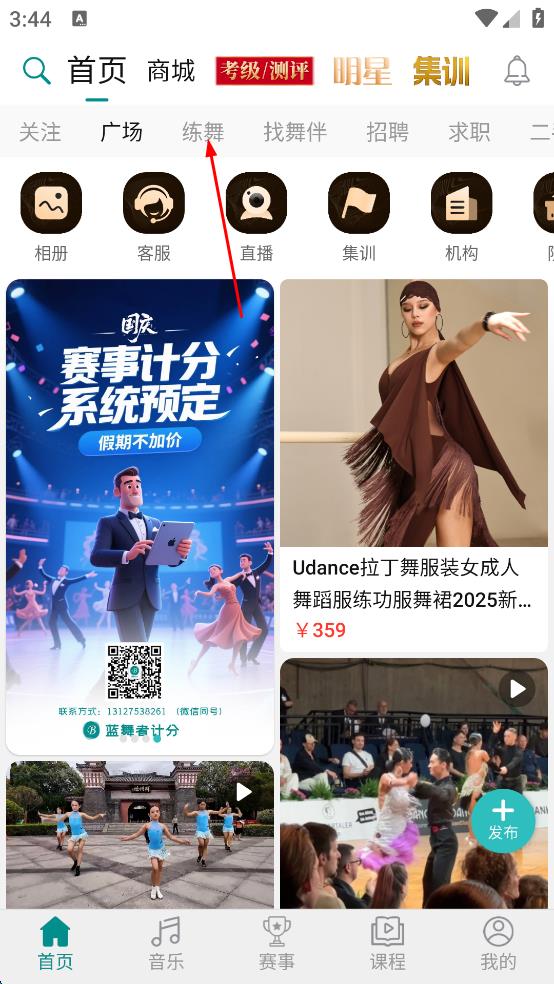 2、在APP主界面,找到上方导航栏中的“练舞”选项并点击,进入练舞内容展示页面。