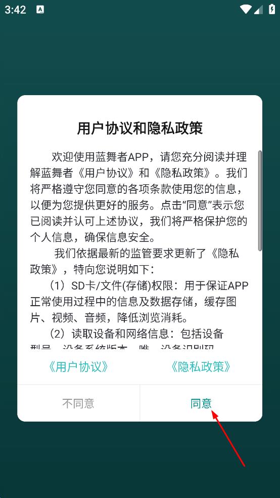 1、打开蓝舞者APP,弹出用户协议和隐私政策提示框,仔细阅读相关内容后,点击“同意”按钮,进入APP主界面。
