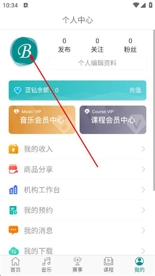 1、打开蓝舞者app,点击底部导航栏的我的选项。