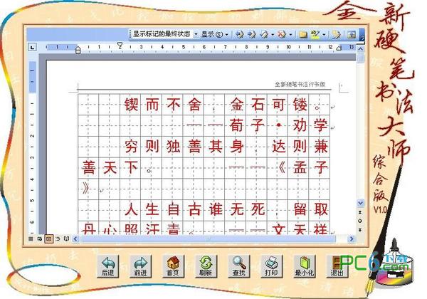 《全新硬笔书法大师》软件特别适合幼儿、中小学生\青年朋友练字。软件自带所需的楷体、隶书和行书硬笔字库。虽然仅有楷体、行书和隶书三种字体,但是都是针对学生和书法爱好者的。它选用全国一流的书法家字体,既有《唐诗精选》、《名言警句》、《英文笑话》、《常用3500字》等字帖样本,还收录了大量的《书法知识》。实践证明:每天写一页,坚持一个月,可以看出明显进步;坚持三个月,即可基本达标。