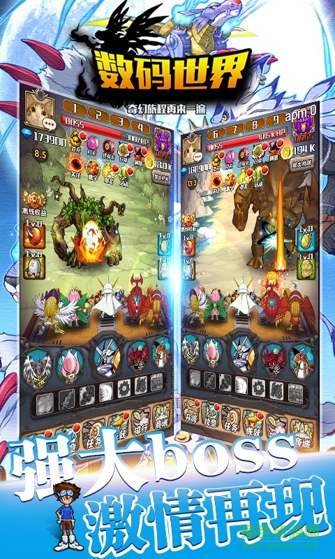 剧情副本带你重回数码世界,还原数码兽对战、进化过程,幼年期、成长期、完全体、究极体,甚至装甲体、混合体等等的特殊进化阶段也完美还原.疫苗、数据、病毒三属性,神圣计划、进化勋章等等各种熟悉的道具应有尽有.