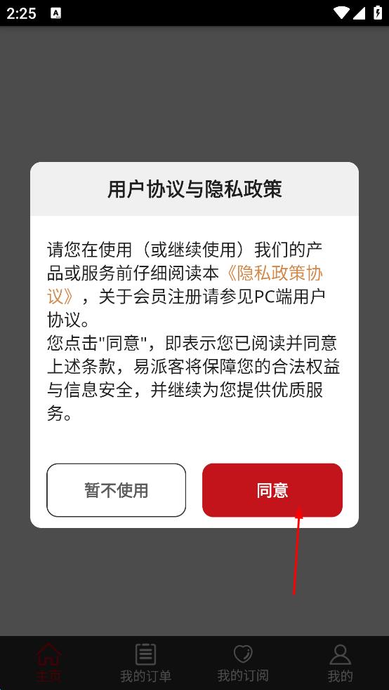 1、打开易派客APP,出现用户协议与隐私政策页面,仔细查看后点击“同意”按钮。