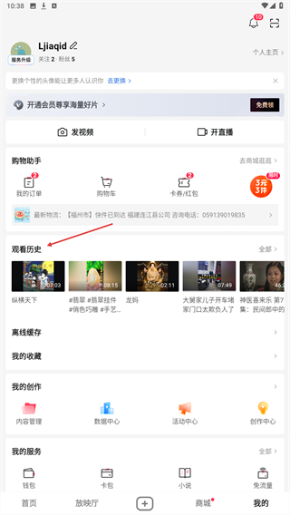 2、进入我的页面内,在下方点击观看历史的按钮。