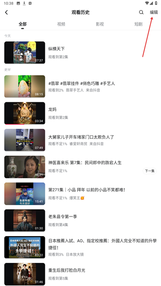 3、进入历史页面内,点击右上角编辑的功能按钮。