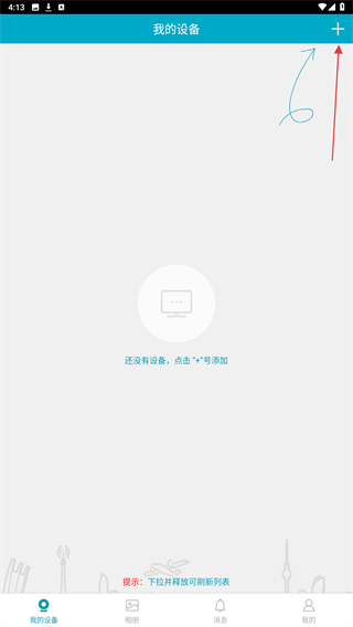 1、打开IPC360监控,在首页右上方点击+的图标。
