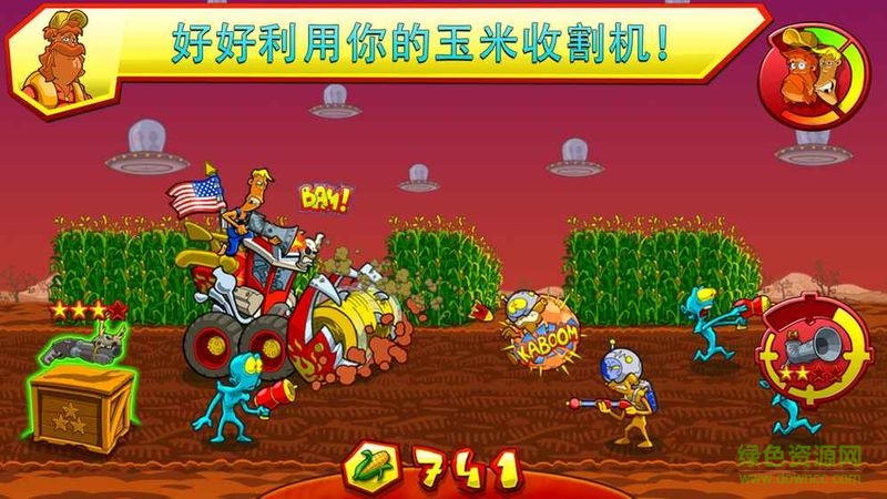 外星人盯上了你的农场,他们看上了你的玉米。赶快开启的的玉米收割机去消灭那些可恶的小偷吧。现在不论是飞船还是危险的障碍,都阻挡不了你要杀死这些侵略者的心情,所以躲开外星人发射的光线,快来保卫你的玉米吧!