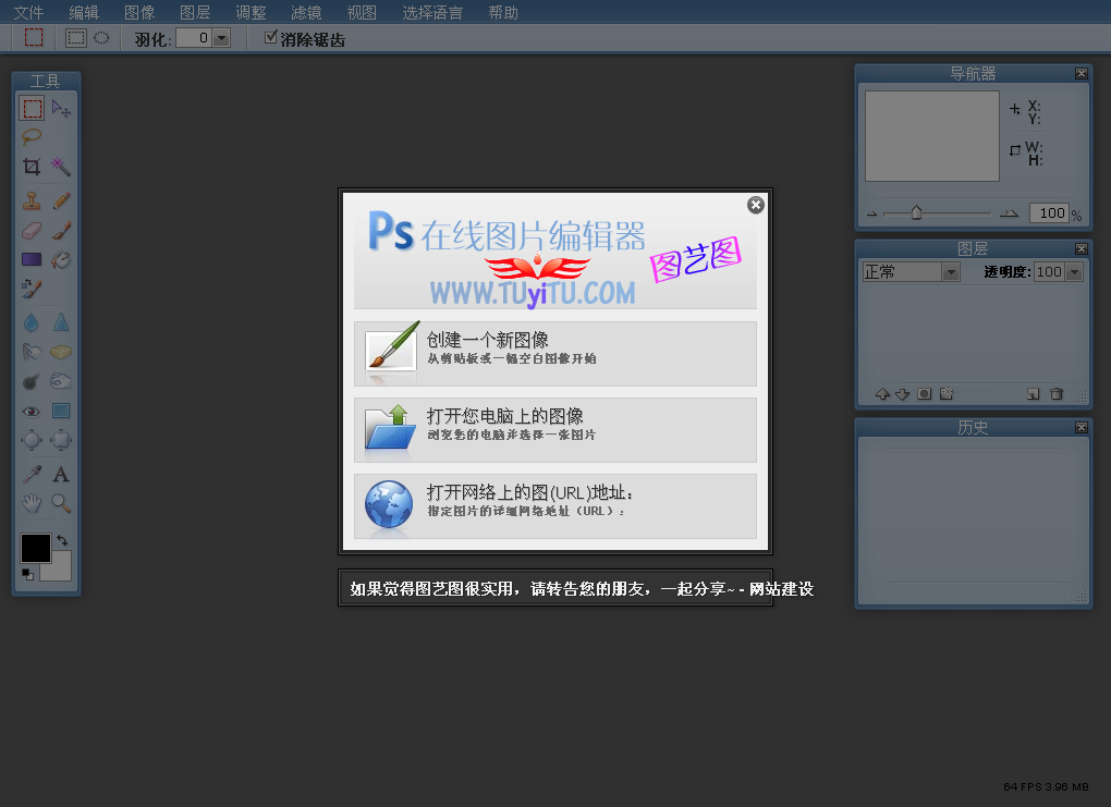 PS在线图片编辑器是图艺图(TUYITU.COM)完全自主研发的在线PS图像编辑软件,是国内领先的在线PS图像处理系统,提供良好的用户体验,丰富的API接口, 支持二次开发。无需安装其它软件插件,安全可靠;纯中文界面,支持多国语言,界面友好;使用简单,让图像编辑随时随地,只要能够上网就能进行在线PS图片编辑,图片编辑不再只是专业人士的工作,每个普通人都可以轻松地在自己的网页上编辑自己的个性化图片。