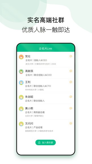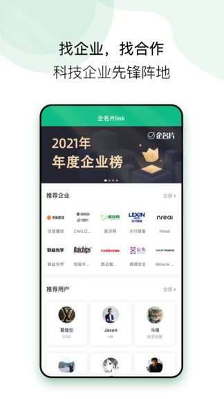 企名片link软件这是一个可以帮助定制个人电子信息版面的名片app,同时平台提供了超级丰富的人脉,用户在这里可以看到各大企业的名片,通过互相了解得到自身所需资源和信息。让用户获取有效信息、深度观点更快捷,让企业内容品牌推广更容易,为商业群体提供高效的连接互动机制。