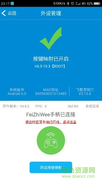 第三步:蓝牙与手柄连接后,进入飞智游戏厅的外设管理,开启按键映射,连接手柄。