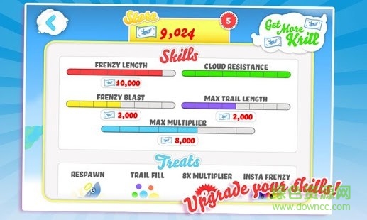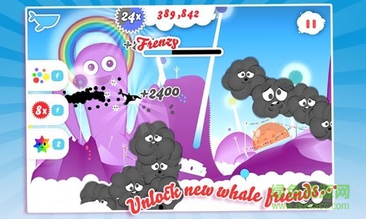 《飞天鲸鱼狂潮 Whale Trail Frenzy》是一款充满了奇幻风格的七彩彩虹世界。七彩虹一般的2D画面,结合充满不可思议的华丽画风,让游戏变得很卡通而且令人感觉到华丽可爱。洁白的云海、各种造型怪异而有趣背景、七彩的气泡和星星,以及一脸怒愤怒的乌云,将会成为小鲸鱼的冒险之旅上的风景。