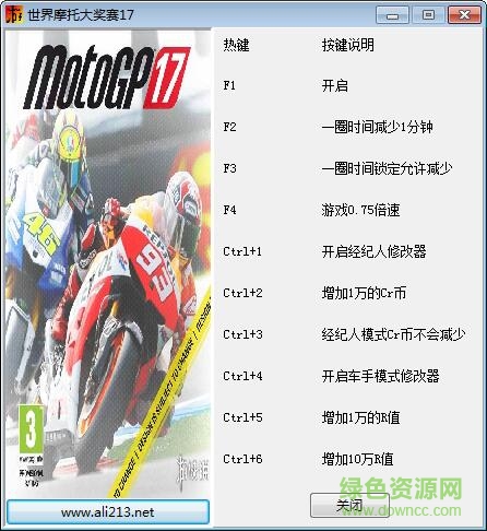 世界摩托大奖赛17修改器是针对同名pc游戏玩家打造的一款辅助工具,使用修改器玩家可以一键修改游戏的某一程序及某一程序文件,轻松打造属性修改功能,需要的朋友欢迎来绿色资源网下载!