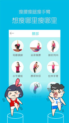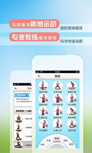 软件设计局部瘦身体感运动,用户可以利用碎片化时间,跟随教练的示范动作,手握手机随时随地运动,体感式设计可以自动采集运动数据,计算运动消耗的热量。