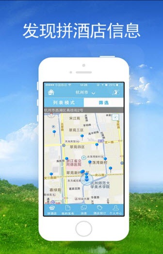 拼酒店是由杭州拼美网络科技有限公司推出的一款基于LBS(地理位置),集成了酒店床位分享、酒店预订、聊天交友等功能的应用。如果是单人入住酒店标间,有多余的床位,通过拼酒店app,您可以把空床位通过信息发送匹配的方式分享给其它的出行者,让其他人与您分担住宿费用。作为一个基于LBS的网络应用平台,拼酒店APP里清晰展示了附近用户发布的拼酒店信息。通过拼酒店APP的在线聊天系统,您可以与附近有相同需求的用户沟通交流,找到志趣相投的玩伴、旅途上的同游者。在降低了住宿成本的同时,又可以交到新的朋友。尽管拼酒店的初衷是为出行者节约住宿成本,但无意间也为大家创造一个线上和线下并存的交友环境。