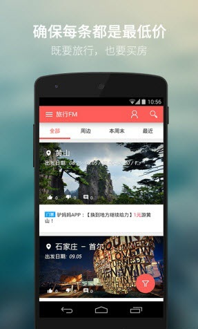 旅行FM特价是一款分享旅游特价信息的APP,每天搜罗旅游网站、旅行社、航空公司、酒店、景区的特价信息,经专业小编人工筛选、分析、鉴定,精选出数十条劲爆到想哭的特价分享给你,1元门票,10元酒店,999元马尔代夫往返机票,1999元北极之旅……天天有!这种人工比价推荐的模式为旅游行业首创,保证了特价信息的劲爆程度和真实有效,最终帮助你省时、省心、省钱,让你可以多出去走走。一直蜗居在城市中的你,是否也想过有一天去环游世界呢?钱不够?没关系,旅行FM特价会带给你最新的各种特价信息,让你不用花费太多钱就能去各地旅行!全网最低价开房、周末游玩、机票旅游,人人用得到的省钱神器!每天人工精选,只推最低!_(:з」∠)_ 打滚卖萌求下载!本特价神器每天搜罗各大网站、旅行社、航空公司的特价信息,由专业小编人工比价分析,精选出数十条劲爆到想哭的特价:1元门票,10元酒店,999元马尔代夫往返机票......天天有!