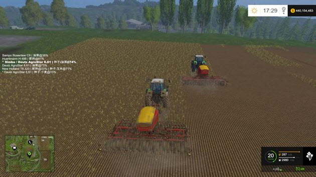 模拟农场15多机械作业MOD,支持雇人模式,多台播种机,收割机可以在大地块同时作业,车道错开。