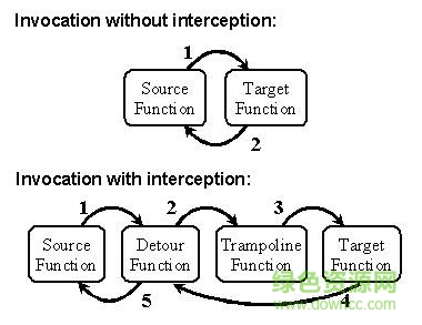 detours库可以拦截任意的API调用,拦截代码是在动态运行时加载的。detours替换目标API最前面的几条指令,使其无条件的跳转到用户提供的拦截函数。被替换的API函数的前几条指令被保存到trampoline 函数(就是内存中一个数据结构)中. trampoline保存了被替换的目标API的前几条指令和一个无条件转移,转移到目标API余下的指令。