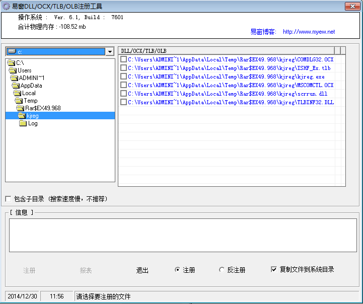 易窗DLL/OCX/TLB/OLB注册工具支持实时显示你当前系统的内存使用情况哦,这个注册工具不是一些注册码之类的,主要是本软件对一些软件程序进行动态控件的加载注册,可以快速帮您注册DLL、OCX、TLB、OLB格式控件,也可快速反注册DLL、OCX、TLB、OLB文件,任意选择要注册的DLL、OCX、TLB、OLB文件,同时可注册两个以上DLL、OCX、TLB、OLB文件! 同时也支持这类文件的反注册哦!