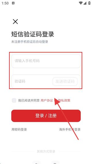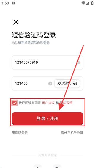 4、勾选我已阅读并同意用户协议和隐私政策后,点击登录/注册按钮,即可完成账号登录。