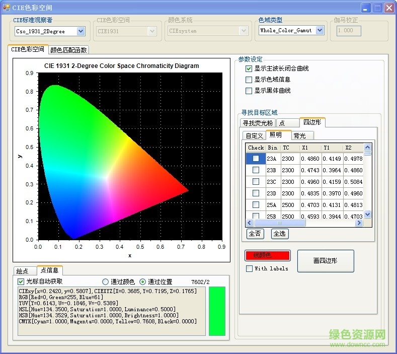 CIE色度软件是一款非常好用的色度匹配和对比软件,支持对CIE1931和CIE1964进行色度坐标图的绘制和进行函数图形的匹配,欢迎有需要的朋友到绿色资源网下载体验吧!