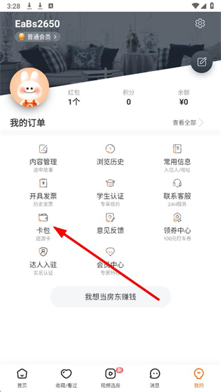 1、在途家民宿app主界面,点击右下角我的选项,进入个人中心页面。