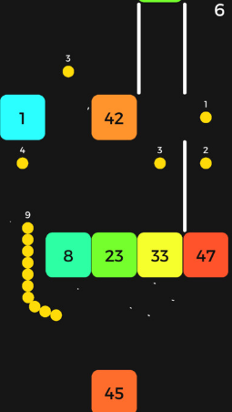 游戏画面由黄色小球和若干富有质感的彩色方块组成,玩家需要操作扭动前行的黄色「长条」——蛇,尽可能吃掉足够多的豆豆,因为标有数字的彩色方块会强行收“过路费”——消耗你的豆豆养料。