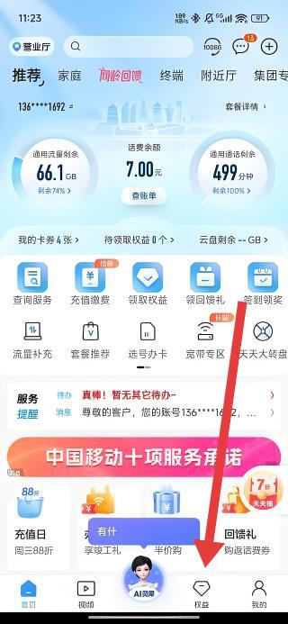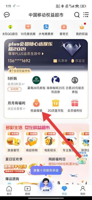 1、打开中国移动APP首页,点击底部导航栏权益选项,进入中国移动权益超市页面,可浏览各类会员权益。