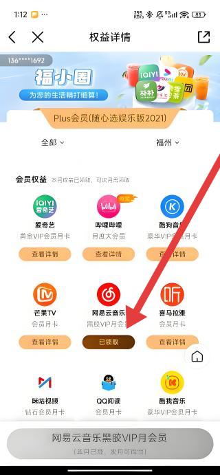 3、进入权益详情页,可查看Plus会员(随心选娱乐版2021)包含的权益,如网易云音乐黑胶VIP月卡等,按需领取使用。