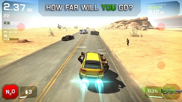 需要说明的是,刚开始进入游戏会黑屏一段时间,各位不要以为游戏是出问题的,只要耐心地等待一段时间就可以了。游戏依然延续了之前的题材,玩家需要在一个广阔的公路上面对各种迎面扑来的僵尸的袭击,而我们的目标也很简单,就是尽可能地将它们甩掉或者开枪打死或者撞死,尽可能地活更长的时间。