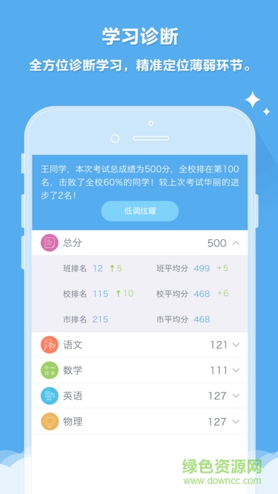 辽阳云成绩手机版是一款专业的学习辅导软件,使用该软件可全面的诊断学生学习状况,精准定位薄弱环节,提供针对性练习快速提高学生学习成绩,还可也在线和其他用户交友分享学习经验,需要的朋友欢迎来绿色资源网下载!