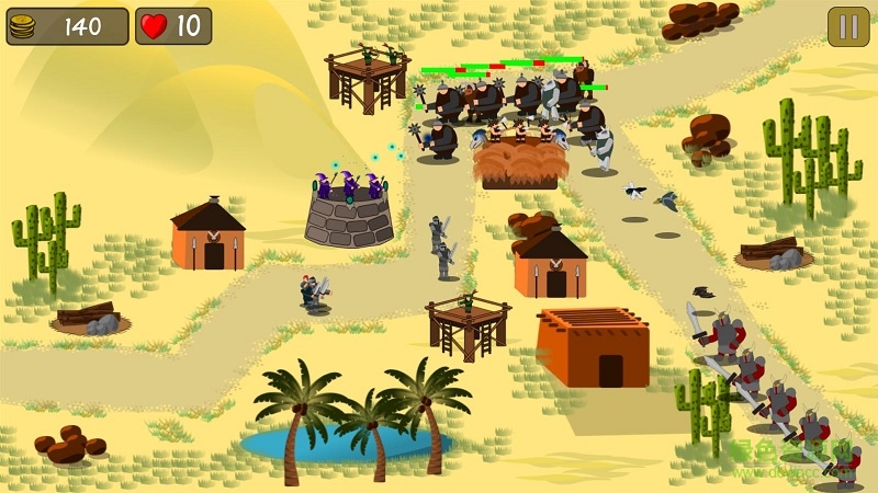 沙漠王国防御战(Desert Kingdom Defens)是一款策略性防御为题材的手机游戏。将你的军队分散在沙漠中,建造防御塔以排斥邪恶的入侵力量。开始建造一个小屋,从那里你可以训练战士,魔术师和弓箭手,还建造塔,从那里你可以保卫王国的魔鬼,兽人,食人魔和神话生物。