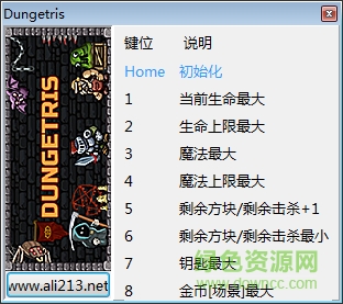 Dungetris八项修改器是针对同名pc游戏玩家提供的而一款辅助工具,使用修改器玩家可以自由修改游戏中的生命、魔法、钥匙等属性,合理的修改游戏属性可以帮助玩家轻松闯关,欢迎来绿色资源网下载!