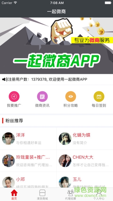 一起微商手机版是一款供微商使用的全方位推广管理服务app,这里有丰富的货源,用户可以在线进行采购和推广,可以学习干货只是和营销技巧,帮助每个微商轻松出单,快乐赚钱,欢迎大家到绿色资源网下载使用!