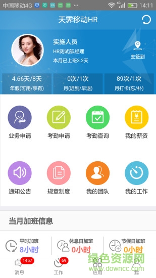 -查看/申请/跟进个人请假、加班、公差、销假、年假、福利假等情况;