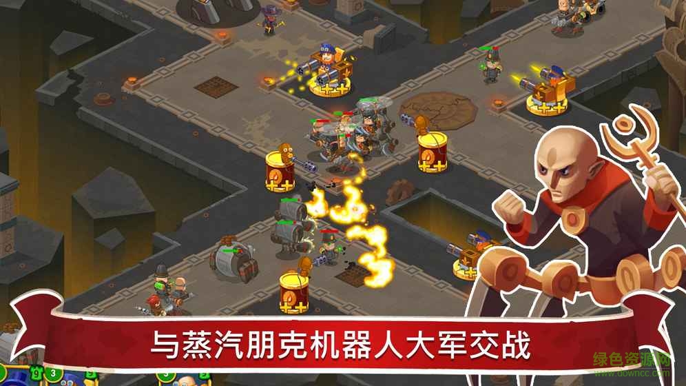 在《Steampunk TD:塔防游戏》中,你将面对若干波无情敌人的进攻。 建造并加固防御塔:加特林机枪、元素火焰喷射器、轰炸机、特斯拉机器人以及发电机。