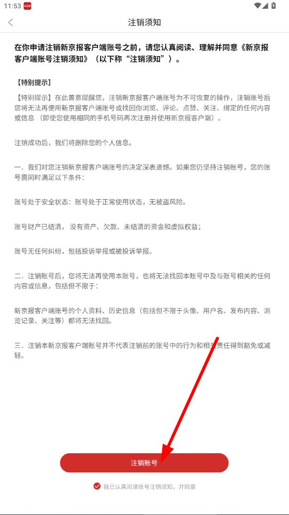 4、仔细阅读注销须知后,勾选同意相关条款,点击注销账号,按照提示完成后续操作即可注销账号。