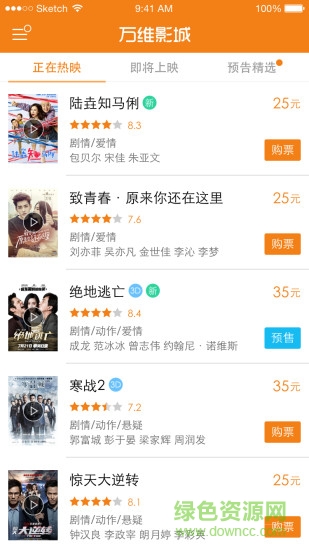 万维影城app是一款影城app,集在线电影购票、预告片预览等功能,为用户带来便捷的影视服务,还有丰富观影优惠活动等你来参加,欢迎到绿色资源网下载体验!
