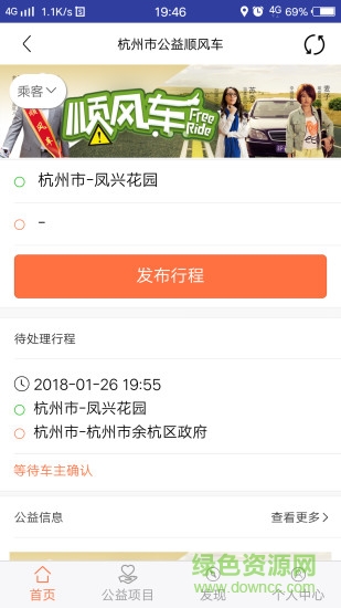 车主在平台注册并平台发布免费搭载车讯,乘客在平台与车主匹配并搭乘,提高全民参与公益的积极性与效率。