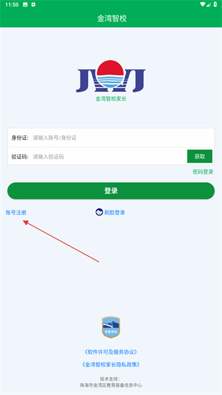 1、打开金湾智校APP,进入时点击左侧账号注册的按钮。