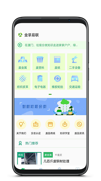 金掌易联是一款提供再生资源废旧回收服务平台。用互联网进行资源整合,为产废企业和用废企业以及商贸企业搭建交易桥梁,促进了再生资源的回收利用,提高了资源利用价值。保护环境,爱护家园,为建设资源节约型、环境友好型社会奉献力量,致力循环经济的发展。